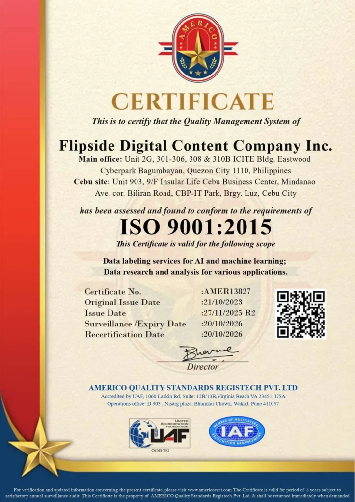 We are committed to delivering high-quality artificial intelligence (AI) machine learning data labeling services to our clients. Our goal is to ensure that the labeled data we provide is accurate, consistent, and delivered on time, meeting or exceeding our clients' expectations. To achieve this, we have implemented a quality management system (QMS) in accordance with ISO/IEC 9001 standards that adheres to the our high principles.
